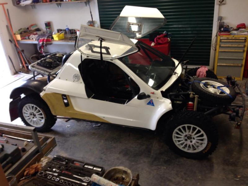 Il s'agit d'un Bugey bug amélioré. Le Bugey bug est un buggy immatriculé qui permet de faire de la route et du chemin, avec un certain confort, je trouve. Mais ce n'est pas un buggy conçu et imaginé pour la course. Nous avons alors apporté mon père (Jean René, le frère d'Yves) et moi-même, quelques modifications pour que l'engin soit plus "typé course" (triangle, crémaillère, boîte un synchro Pelin, moteur 2L Mégane RS...).